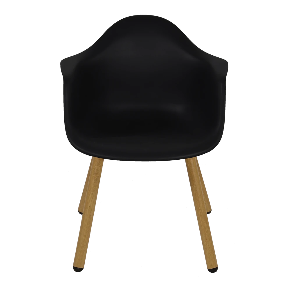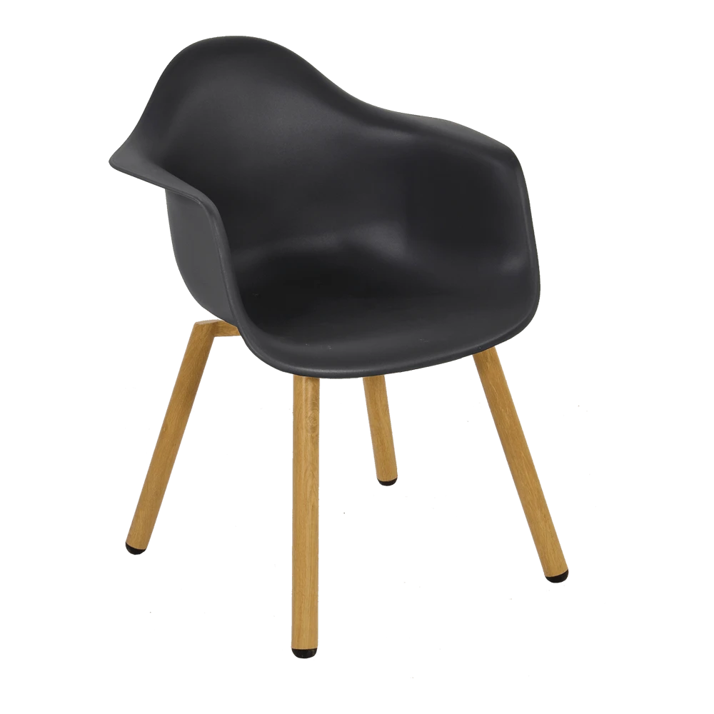 Het onderstel van de stoel heeft een houtlook, maar is vervaardigd uit aluminium. Hierdoor staat het niet alleen mooi, maar is de stoel ook onderhoudsvriendelijk! Het zitgedeelte is gemaakt van kunststof en bevat gaatjes voor de afvoer van (regen)water. Kunststof is sterk, onderhoudsarm en licht in gewicht. Beide materialen zijn zeer geschikt voor buiten.